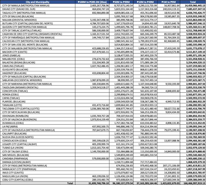 - Baliuag City in Bulacan, PhP6.02 billion;