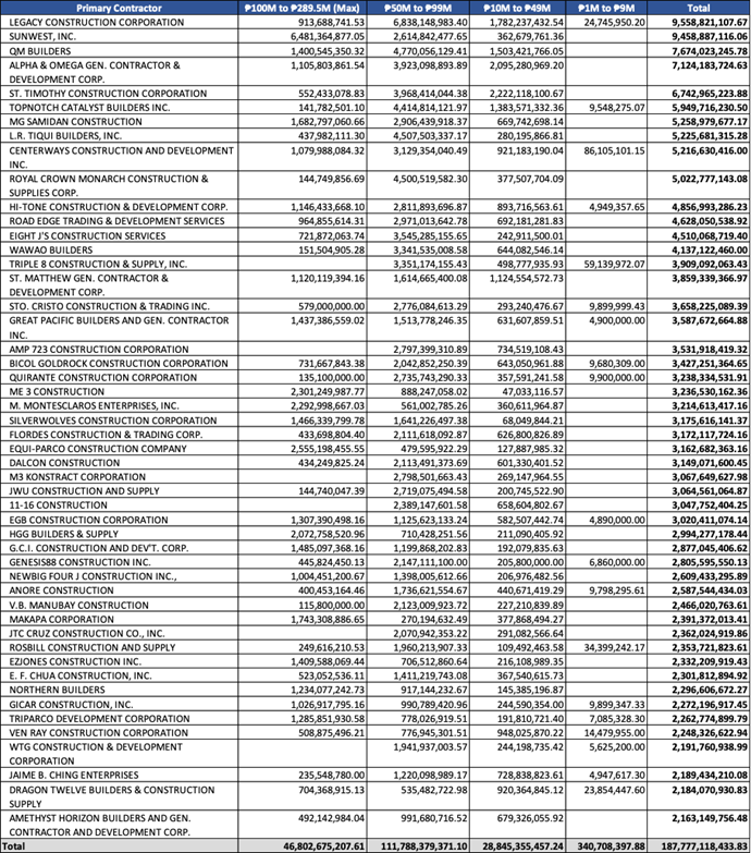 The ghost, substandard, and kickbacks-ridden contracts that the top 18 contractors won — altogether almost 20 percent or PhP100 billion of the PhP546-billion aggregate value of 9,827 projects — have been initially exposed.
